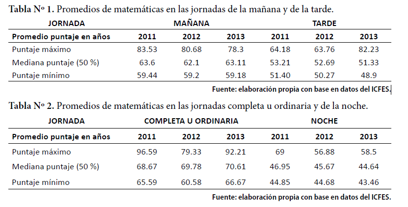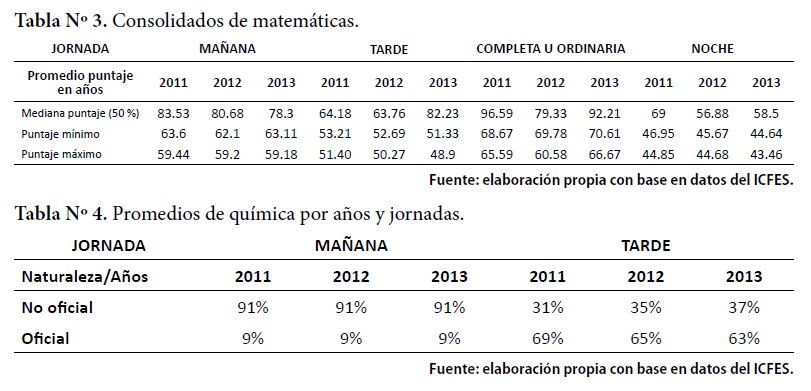 Para dicho análisis, se tuvieron en cuenta los resultados de las pruebas Saber 11 aplicadas por el ICFES entre 2011 y 2013, de acuerdo con las jornadas de la mañana, la tarde, la noche y la completa u ordinaria4 , así también el carácter público y privado de las instituciones.