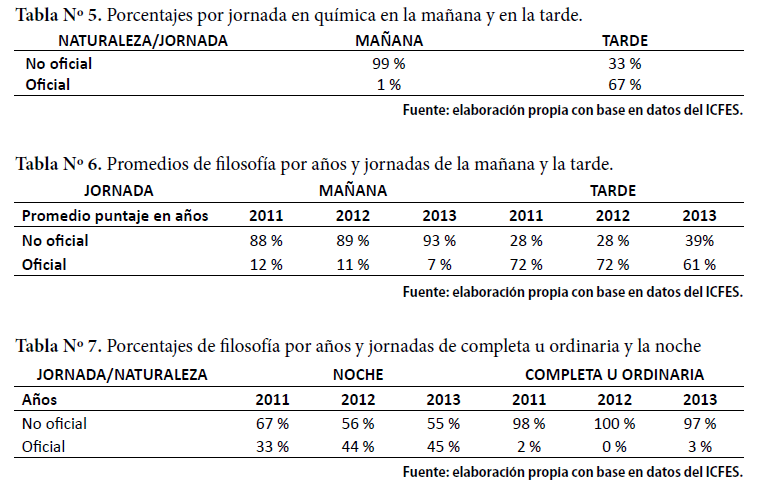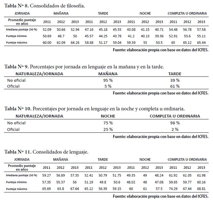 Además, se debe tener en cuenta que, de acuerdo con los resultados nacionales obtenidos, el comparativo entre 2011, 2012 y 2013, evidenciados en las tablas y sus porcentajes anteriores en las cuatro áreas seleccionadas (matemáticas, química, filosofía, y lenguaje), el porcentaje más alto en los tres años consecutivos lo obtuvo la jornada completa u ordinaria, no oficial, seguida de la jornada de la mañana, no oficial. En el tercer lugar, se ubicaron las jornadas: noche no oficial, tarde oficial, y noche no oficial, y en cuarto lugar las jornadas tarde oficial, noche oficial, noche no oficial y tarde oficial. Este hecho coincide con los hallazgos de Bonilla (2011) quien indica que los estudiantes de las jornada completa obtienen mejores resultados debido al impacto efectivo de la jornada.