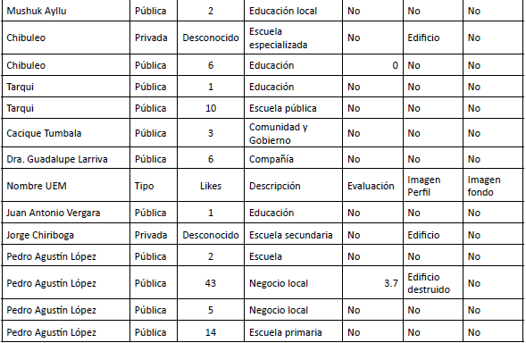 Para analizar las páginas encontradas fueron consideradas dos preguntas guía: ¿Cuál es la visibilidad de la página? y ¿Cómo son representadas las UEM? Para responder a la primera pregunta se toman en cuenta los likes de cada página en relación a su comunidad estudiantil. Para la segunda se analizó la descripción, imágenes de fondo y perfil, así como la existencia y potencial calificación obtenida por la institución en el gadget de evaluación de Facebook (Anexo: Tabla 2).