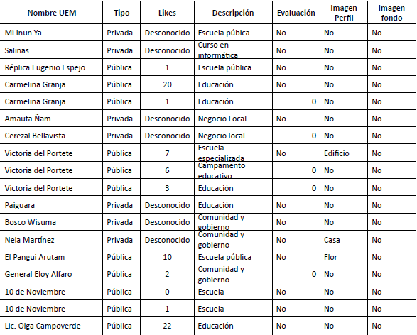Los 30 enlaces restantes de las dos búsquedas se repartían entre: instituciones que sin ser UEM tenían en su nombre las palabras: “Unidad”, “Educativa”, “Milenio” por ejemplo la “Unidad Educativa Nuevo Milenio”, o la “Unidad Educativa Tercer Milenio”, también enlaces que se referían a UEM próximas a inaugurarse como la UEM “Wankurishpa Yachana Pampa Mushuk Ayllu”, y enlaces diversos como el club de cocina de una de las UEM, comunidad de egresados, Consejo Estudiantil y bolsas de empleo para profesores. Las páginas analizadas reflejan la diversidad de aplicaciones que los actores de red dan a las páginas institucionales de Facebook, ya sean estas oficiales o no.