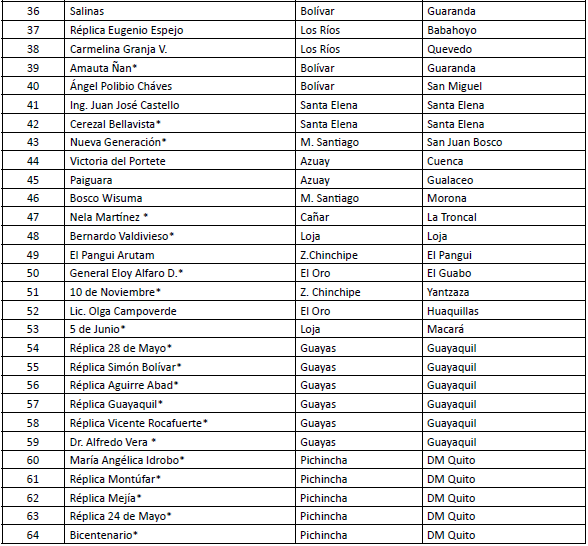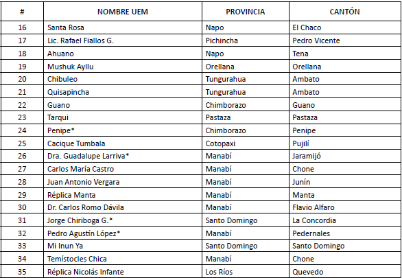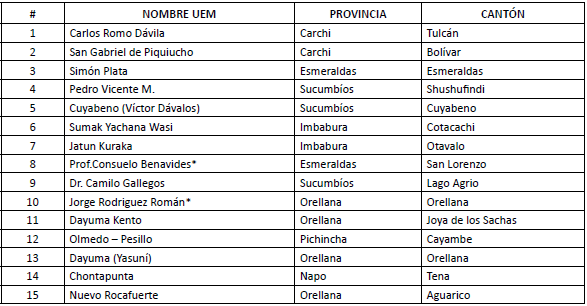 9. Ministerio de Educación del Ecuador. (2010). «Unidades Educativas del Milenio en funcionamiento». Recuperado de: http://educacion.gob.ec/uem-en-funcionamiento/ [Último acceso: 31/07/2016].