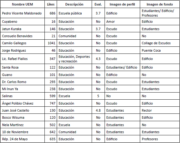 La UEM “Jorge Rodríguez Morán” coloca como foto de perfil la entrada de la unidad. Todas las unidades tienen como color base el blanco y el motivo principal corresponde al logo de la marca país: “Ecuador ama la vida”, parte de una campaña de posicionamiento turístico, a nivel mundial. Cuatro UEM colocaron como figura de perfil a los estudiantes en diversas situaciones de aula o en eventos institucionales. Mayoritariamente, los estudiantes son representados en clases, junto a los edificios o reunidos para una imagen grupal. En principio, es posible atribuir esta elección a la intención de colocar al grupo de discentes como protagonistas y como sujetos centrales para las UEM.