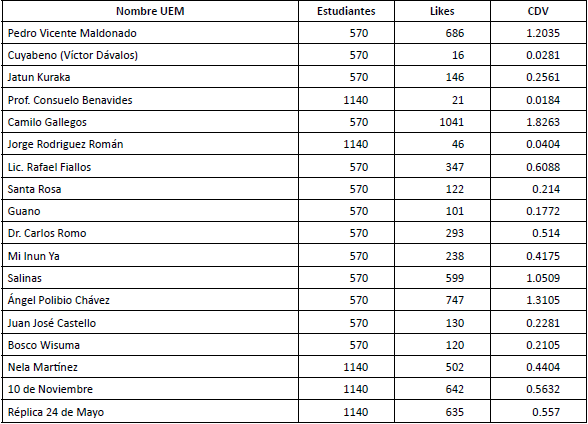 El promedio del CDV de las páginas no oficiales es de 0,0172 para las páginas no oficiales públicas de las UEM; es decir, que se tendría poco menos de 2 likes por cada cien estudiantes. Aparentemente, las páginas creadas, si bien llevan el nombre de la institución, atraen poco interés o sólo están hechas para grupos limitados dentro de la misma. La página no oficial con el coeficiente de visibilidad más alto y con amplia diferencia respecto a las demás, corresponde a la UEM “Alfredo Vera Vera” con un valor de 0,203 aproximadamente.