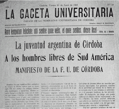 Los sucesos acaecidos recientemente en la Universidad de Córdoba, con motivo de elección rectoral, aclara singularmente nuestra razón en la manera de apreciar el conflicto universitario. La Federación Universitaria de Córdoba cree que debe hacer conocer al país y América las circunstancia de orden moral y jurídico que invalidan el acto electoral verificado el 15 de junio. El confesar los ideales y principios que mueven a la juventud en esta hora única de su vida, quiere referir los aspectos locales del conflicto y levantar bien alta la llama que está quemando el viejo reducto de la opresión clerical. En la Universidad Nacional de Córdoba y en esta ciudad no se han presenciado desordenes; se ha contemplado y se contempla el nacimiento de una verdadera revolución que ha de agrupar bien pronto bajo su bandera a todos los hombres libres del continente. Referiremos los sucesos para que se vea cuanta vergüenza nos sacó a la cara la cobardía y la perfidia de los reaccionarios. Los actos de violencia, de los cuales nos responsabilizamos íntegramente, se cumplían como en el ejercicio de puras ideas. Volteamos lo que representaba un alzamiento anacrónico y lo hicimos para poder levantar siquiera el corazón sobre esas ruinas. Aquellos representan también la medida de nuestra indignación en presencia de la miseria moral, de la simulación y del engaño artero que pretendía filtrarse con las apariencias de la legalidad. El sentido moral estaba oscurecido en las clases dirigentes por un fariseísmo tradicional y por una pavorosa indigencia de ideales.