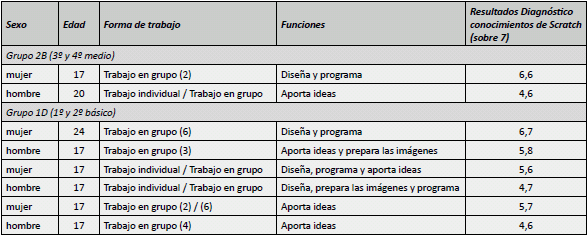 En la Tabla 1 se presentan algunas características relevantes de la muestra: edad, sexo, forma en que trabajaron y funciones dentro del grupo.