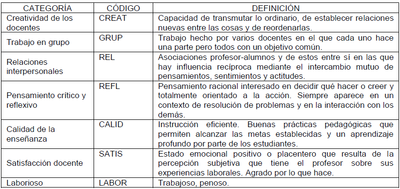 A continuación, presentamos el listado de categorías, así como los códigos correspondientes y la definición de cada una (ver tabla 1):