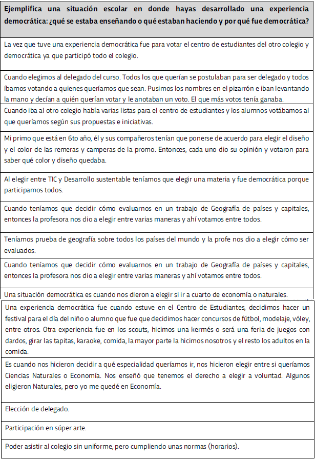 Si entendemos que el sistema educativo debe formar, entre otras cuestiones, para la ciudadanía democrática para la democracia: ejemplifica una situación escolar en donde hayas desarrollado una experiencia democrática (solo como orientaciones puedes incluir tipo de institución, materia o situación, ¿qué se estaba enseñando, por qué fue democrática la situación? En el siguiente cuadro, se ilustran los resultados obtenidos: