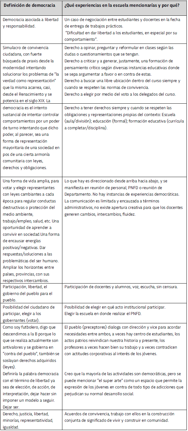 Por su parte, en relación con el decir de los docentes, se trabajó con una consigna que incluía dos interrogantes: 1) “Si tuvieras que definir democracia, ¿cómo la definirías o con qué palabras la asociarías?”, pregunta que estaba orientada a explorar las concepciones sobre democracia; 2) “Si tuvieras que mencionar en esta escuela experiencias que entiendas que son democráticas, ¿qué experiencias mencionarías y por qué?”. Con esta consulta, buscamos conocer las experiencias de ejercicio democrático en la propia escuela.