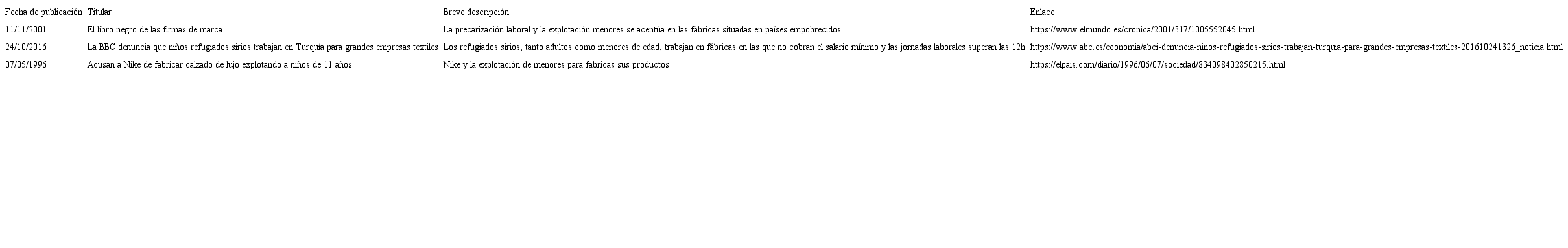 Por otro lado, la segunda sesión se centró en la problemática de la explotación laboral infantil. Esta sesión estaba dividida en varias fases: 1) La maestra explicó la actividad que consistía en la lectura de una serie de noticias sobre las cuales debían trabajar en grupo con el objetivo de reflexionar y buscar soluciones a esas situaciones de injusticia. Las noticias que se trabajaron en el aula fueron seleccionadas por el juicio experto de la docente y estaban ligadas a marcas comerciales que ellos pudieran conocer. La Tabla 1 recopila las noticias empleadas junto con una breve síntesis de cada una de ellas; 2) El alumnado fue dividido en grupos para leer las noticias y reflexionar sobre ellas, tomando anotaciones y proponiendo soluciones que posteriormente tendrían que poner en común; 3) Tras estos debates grupales, la persona designada como portavoz explica a sus compañeros lo que piensa su grupo sobre esas noticias y las soluciones que proponen; 4) La profesora se encargó de guiar el debate de los alumnos hacia una perspectiva en la que se defiendan los Derechos Humanos y los Derechos de la Infancia; y 5) El alumnado y la docente reflexionan en su diario de aula de manera individual sobre la temática tratada en esta sesión.