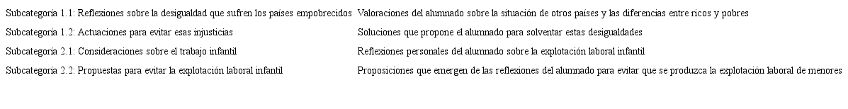 Se ha optado por una metodología cualitativa porque se pretende profundizar en las reflexiones críticas que el alumnado va reflejando en su diario durante la realización de una propuesta didáctica sobre justicia social. Es decir, se emplea una visión cualitativa para, como señala Alonso (1998): “examinar las producciones significativas de los propios sujetos —discursos, imágenes, relatos, representaciones, etc. — generadas y construidas por los actores, o en el diálogo con ellos, en sus propios contextos situacionales, sociales e históricos” (p.24). Por tanto, este estudio se sustenta de las reflexiones que el estudiantado y la docente reflejan en sus diarios, siendo este un instrumento que permite recopilar datos valiosos sobre lo que tiene lugar en la escuela y formar ciudadanos democráticos (Morduchowicz, 1995; Zabalza, 2004). A modo de justificación, se debe señalar que este tipo de análisis cualitativo resulta positivo para valorar las significaciones que surgen de esta experiencia didáctica, para realizar comparativas y ser conscientes de las concepciones personales de uno mismo para promover un cambio en las formas de actuar (Buenfil, 1993). El anonimato del estudiantado participante se garantiza mediante el establecimiento de una codificación de los diarios, la cual ha consistido en asignar E1 al primer estudiante, E2 al segundo y así sucesivamente; además, se ha tenido en cuenta si el diario pertenecía a un niño (añadiendo H) o a una niña (incorporando M) (Taylor y Bogdan, 2010). Adicionalmente, para el análisis de los discursos de los diarios, y conforme a los objetivos de este estudio, se han establecido las siguientes categorías y subcategorías que han facilitado el análisis de la información recopilada, las cuales se encuentran en la Tabla 2.