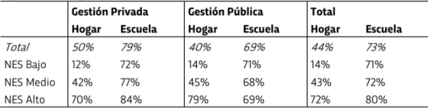 En la Tabla 1 se puede observar la proporción de alumnos de último año de la escuela secundaria que declaran tener una computadora en su hogar y la proporción que dicen usar una en la escuela. En promedio, 44% de los alumnos dicen tener una computadora en su hogar—en las escuelas de gestión privada el 50% de los alumnos y en las de gestión pública el 40%—, mientras que el 73% dice usar una en la escuela—79% de los alumnos en las escuelas de gestión privada y 69% en las de gestión pública—. Tal como puede apreciarse, existen grandes diferencias según el nivel socioeconómico (NES) de los alumnos. Solo el 14% de los estudiantes de bajo NES tiene computadora en su hogar, mientras que el 72% de los de alto NES dice tener. Por el contrario, los valores en la escuela son similares para todos los niveles socioeconómicos, y en ningún caso es menor a 68%. En este asunto, se ve claramente la función de la escuela secundaria de acercar la tecnología a los hogares, puntualmente en lo que respecta al uso de las computadoras.