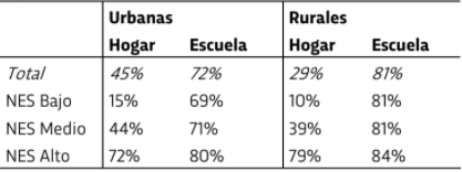 Si analizamos estas mismas proporciones según el ámbito de la escuela, puede observarse que, en las escuelas rurales, es todavía más importante el rol compensatorio. Solo el 29% del total de estudiantes rurales dicen tener una computadora en sus hogares, mientras que el 81% utiliza la computadora en la escuela. Entre los estudiantes con bajo NES, solo el 10% tiene en su hogar y el 81% utiliza una en la escuela. Es decir, 7 de cada 10 estudiantes rurales tiene experiencia de usar la computadora gracias a asistir a la escuela (ver Tabla 2).