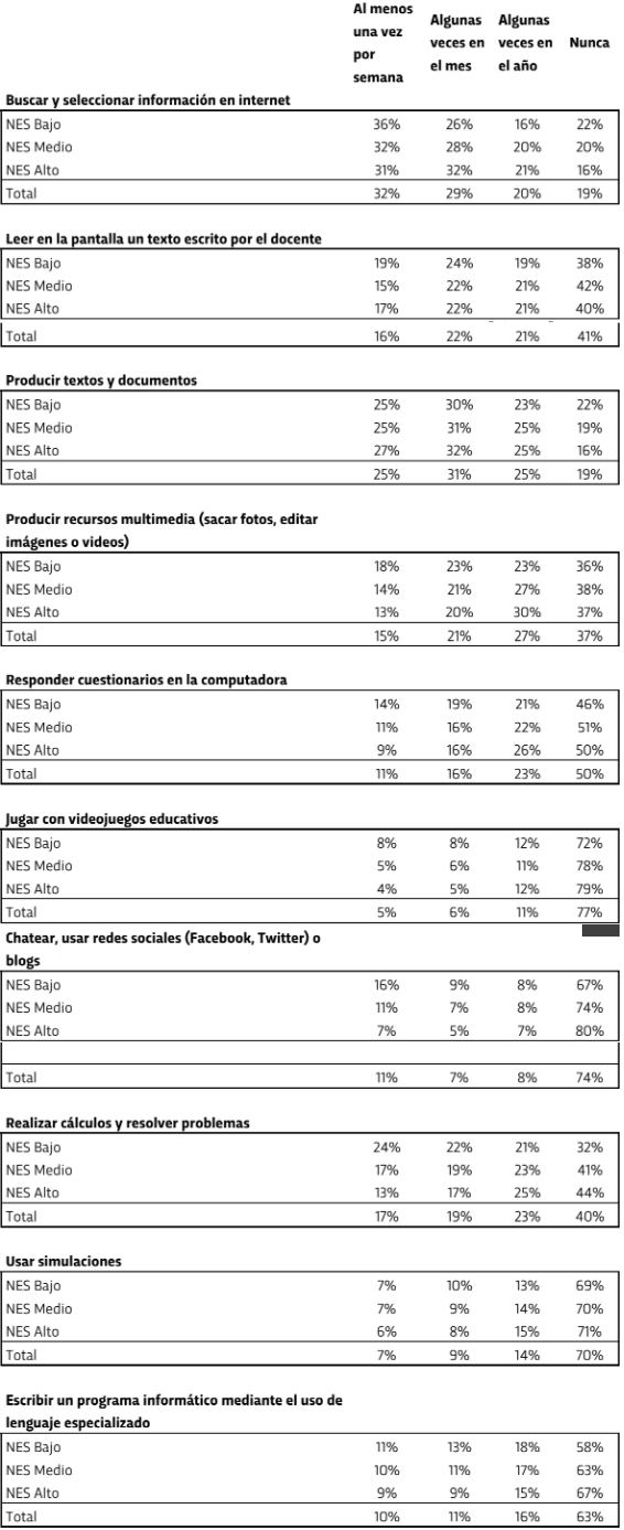 Tófalo (2017) encuentra, con base en los datos de Aprender 2016, que en el ámbito de la educación secundaria los estudiantes señalan que la búsqueda de información en internet, la lectura y producción de textos digitales y el trabajo colaborativo con pares son las actividades que se realizan más asiduamente en las aulas cuando se utilizan computadoras. Por el contrario, el empleo de simuladores, videojuegos educativos y redes sociales, así como también la programación informática, son los tipos de uso menos habituales. En este sentido, el uso pedagógico de las TIC aparece asociado en mayor medida con el empleo de programas y recursos más sencillos de operar o de uso más extendido: procesadores de texto, visualizadores de documentos escritos o motores de búsqueda en Internet. Por el contrario, las actividades menos habituales involucran tareas más complejas desde el punto de vista de los recursos implicados, tales como lenguaje de programación, manejo de software de simulación o de programas de cálculo matemático. Otro elemento que parece incidir en las propuestas de los docentes es la escasa predisposición a incluir recursos comúnmente asociados con actividades recreativas o de ocio por parte de los niños, niñas y jóvenes, tales como redes sociales, videojuegos o chats. En este trabajo, ampliamos esos resultados agrupando a los alumnos según su nivel socioeconómico (bajo, medio o alto).
