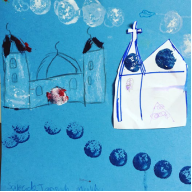 A los niños les llevó un largo tiempo llegar a la imagen de los dos lugares de culto (ver Figura 4) El trabajar juntos en una pieza de arte compartida es central para mi método; se les pide a los niños que colaboren en una encuesta compartida como forma de trabajo grupal. Para muchos de ellos, los rituales, las palabras, los símbolos, las ideas se suturan a la idea de la religión dada. La pertenencia se articula a través de las culturas material, visual y digital que pueden ser específicas de la religión.