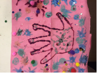 El segundo ejemplo, nos traslada al oeste de Sidney y a mi trabajo de campo en comunidades de servicio de reasentamiento de refugiados (ver Figura 8) en color, textura y forma. El significado de la expresión de la forma está dado por la mano rosa hecha con henna que tradicionalmente simboliza la celebración de Eid en la cultura musulmana. La tela rosa está cubierta de pompones, lentejuelas, y estrellas pintadas que explotan; las cuales se supone que son fuegos artificiales. En el centro del cuadro se encuentra la mano decorada hecha por una niña musulmana-australiana para simbolizar la experiencia encarnada y muy especial de celebrar a Eid (ver Figura 8)