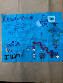 El árbol presenta los nombres de la familia de la joven artista británica y lo rodean otros símbolos del Islam; como la luna creciente, las estrellas, y además las palabras Celebración e Islam. Los miembros ya fallecidos de la familia se nombran en globos con forma de corazón que dicen QEPD. La textura y la dimensión están dadas por botones, por cepillitos limpia-cañerías, brillantina y pintura. Los colores y las formas muestran, claramente, una larga tradición de cultura visual islámica (ver Figura 7)