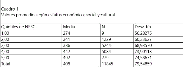 Para estimar los niveles de desempeño promedio según la condición económica social y cultural de los/as estudiantes, utilizamos el indicador NESC que describimos anteriormente. Con base en este, construimos quintiles de nivel económico social y cultural y calculamos el puntaje promedio que obtuvieron los/as estudiantes de cada quintil. El Cuadro 1 muestra los resultados de esta primera estimación.