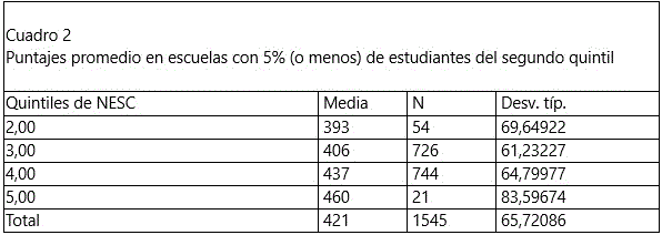 En este caso, volvimos una vez más a esa búsqueda, pero intentando un camino ligeramente distinto al comúnmente utilizado, sobre todo para el caso de Argentina. En lugar de comparar estudiantes de diversos estratos sociales, comparamos estudiantes del mismo estrato que concurren a establecimientos educativos diferentes. Focalizándonos en la composición social de las escuelas, comparamos aquellas donde los/as estudiantes del segundo quintil de NESC representaban pequeñas minorías, con otras donde constituían proporciones más numerosas del estudiantado. El resultado inicial es que los/as estudiantes del segundo quintil del nivel económico, social y cultural que concurrían al primer tipo de escuela obtenían puntajes más altos en las pruebas estandarizadas que los que concurrían al segundo. De manera que, en principio, parecería ser que la composición social de estas escuelas influye en los niveles de logro de los/as estudiantes con menores recursos relativos. Esto sugería, entonces, una potencial confirmación del “efecto pares”.