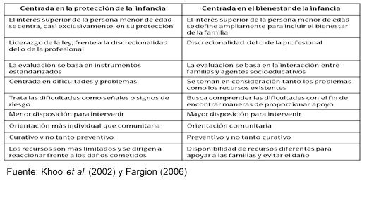 Señalar que existen diferentes maneras de entender la acción socioeducativa, y que conllevan distintos modos de entender los roles de los profesionales y de las personas participantes (Fargion, 2006, 2007). Estas dos aproximaciones están íntimamente ligadas a los dos tipos de cultura profesional identificados por Fargion (2007). Según Reynaert et al. (2010) y Roose y Bouverne-De Bie (2007, 2008), la aproximación centrada en la protección de la infancia está relacionada con la cultura profesional denominada ilustrada y, a su vez, estaría vinculada a una visión legalista de la Convención internacional sobre los derechos del niño. La aproximación centrada en el bienestar, en cambio, estaría relacionada con la cultura profesional denominada romántica y una visión sociopolítica de la Convención.