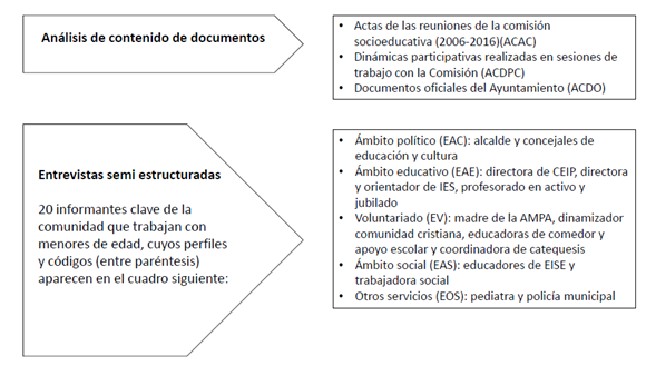 Una vez que el equipo de investigación accedió al municipio y, tras un periodo de acomodación y negociación, nos pudimos incorporar a dicha Comisión y el trabajo de campo se realizó en el marco de la misma, centrando nuestra atención en diferentes agentes de la comunidad que trabajan con las personas menores de edad desde diferentes ámbitos. En la imagen adjunta, se detallan las técnicas utilizadas para la recogida de la información, así como el listado de las personas entrevistadas.
