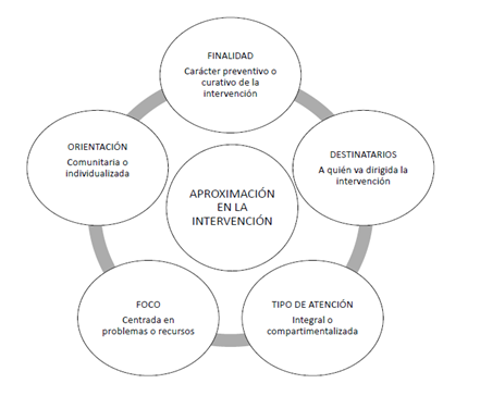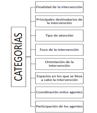 En este artículo, nos centraremos en las siguientes categorías, por considerar que son las que definen las claves de la aproximación o la mirada: finalidad de la intervención, principales destinatarios de la intervención, tipo de atención, foco de la intervención y orientación de la intervención. En la siguiente imagen, se visibiliza el sentido que le hemos dado a cada una de estas categorías.