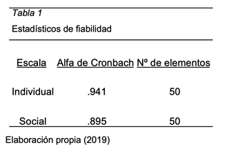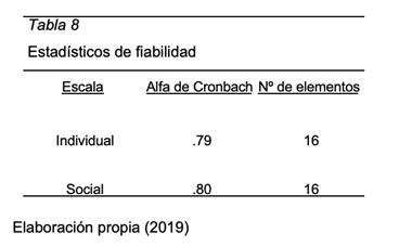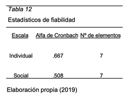 Los resultados establecidos en la Tabla 12 indican el nivel de confiabilidad que tiene el instrumento, a nivel individual se obtuvo un Alfa de Cronbach de .667 y, en la escala social, se obtuvo una confiabilidad de .508. Mediciones que puntúan bajo, pero son aceptables.