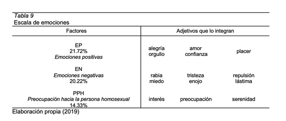 La escala de emociones individuales hacia las personas homosexuales obtuvo una consistencia interna de .79 para la escala individual y .80 para la escala social. Está conformada por 16 emociones, con las cuales se evaluó el aspecto emocional del prejuicio (ver Tabla 8).