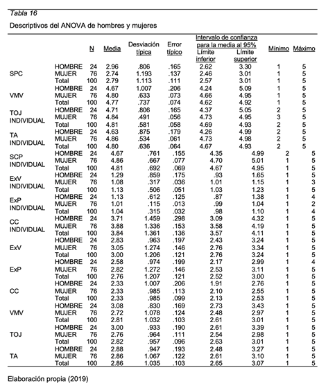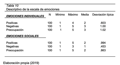 Una vez realizado el análisis factorial, se procedió a realizar el análisis descriptivo de tendencia central y variabilidad de cada factor, en el cual se muestran la media y desviación típica tanto de las emociones individuales como de las emociones sociales (ver Tabla 10).