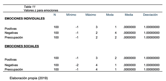 Para poder comparar entre sí las medias de cada factor y determinar qué factor tiene más peso, hubo que estandarizar las medias, ya que cada factor tiene diferente número de emociones. La estandarización se presenta a continuación (ver Tabla 11).