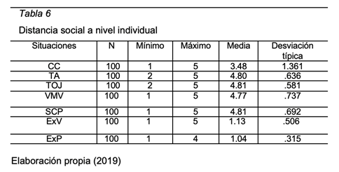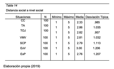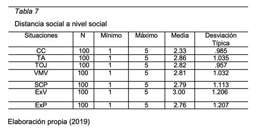 La distancia social se refiere al grado de contacto que se considera aceptable con los miembros de un determinado grupo. Para este estudio, se empleó un instrumento integrado por siete situaciones: