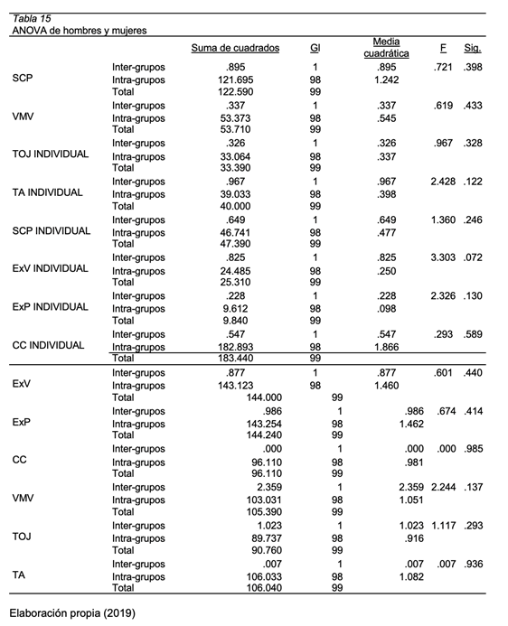 Se llevó a cabo el análisis de varianza factorial, para establecer las relaciones existentes entre las variables sexo y religión con la distancia social. En la Tabla 15, se muestra el ANOVA de mujeres y hombres, tanto a nivel social como individual.