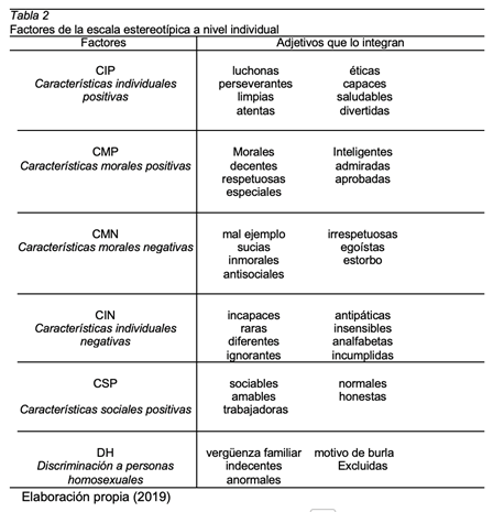 Después de la validación psicométrica realizada por medio del análisis factorial, la escala de creencias estereotípicas individuales quedó conformada por seis factores que explican el 60.08% de la varianza total acumulada después de la rotación. Los adjetivos que representan cada afirmación de esta escala se muestran en la Tabla 2 que, a continuación, se presenta: