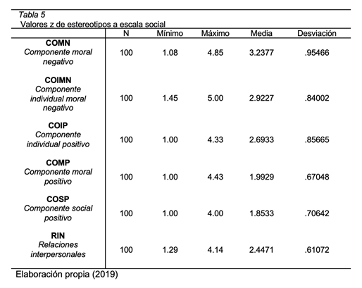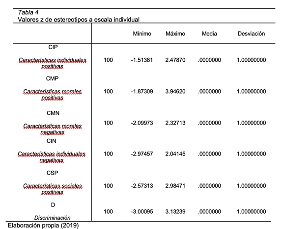 El coeficiente α se utiliza para intervalos, los coeficientes oscilan entre 0 y 1, donde el coeficiente 0 significa nula confiabilidad y 1 representa un máximo de confiablidad. El Alfa de Cronbach para la escala de estereotipos a nivel individual fue de .941. Para la escala de estereotipos a nivel social, el Alfa de Cronbach fue de .89, como lo muestra la Tabla 1. Ambos coeficientes son altos, por lo que se puede confiar en las puntuaciones de la muestra.
