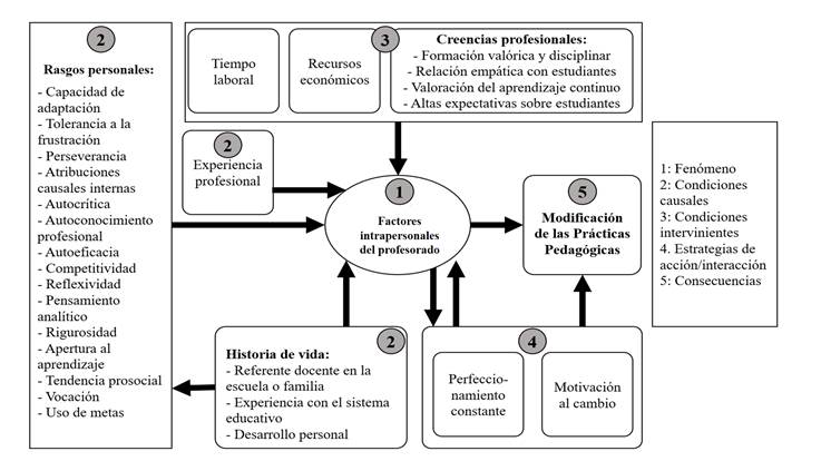 Sumado a lo anterior, destacan las creencias profesionales de las y los docentes, pues si bien los rasgos personales se vislumbran como el elemento causal, estas encaminan el cambio en la medida que las creencias se encuentran en consonancia. Es decir, si las creencias de los y las docentes son coherentes con la importancia o motivación de modificar sus prácticas pedagógicas, los factores intrapersonales se expresan a favor de este cambio. En este fenómeno, se puede observar que las y los docentes reaccionan elevando su motivación por el cambio y generando estrategias para mantenerse en constante perfeccionamiento, ya sea mediante estudios formales o informales. Estas reacciones del profesorado, en conjunto a la influencia de los factores intrapersonales, tienen por consecuencia la modificación de las prácticas pedagógicas en pos del logro de los aprendizajes por parte de las y los estudiantes.