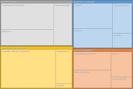Como se observa en la Figura 1, las motivaciones de los informantes hacia el proyecto educativo en el que se encuentran inmersos se engloban en cuatro tendencias motivacionales esenciales. Aunque todas ellas gozan de una alta presencia en los relatos de los casos, ordenadas por su mayor peso discursivo, estas son: la promoción del desarrollo integral de la persona, la oposición a la escuela tradicional, la búsqueda de la felicidad de la infancia y la confianza en los principios pedagógicos de la escuela alternativa.