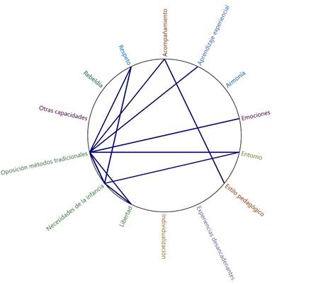 La correlación categorial más fuerte se estableció entre las categorías “oposición a los métodos tradicionales” y “necesidades de la infancia” con un coeficiente de Jaccard de 0,83. Esto señala la creencia por parte de los informantes de que los métodos de la enseñanza tradicional no responden adecuadamente a las necesidades de la infancia. La categoría denominada “necesidades de la infancia” presenta asimismo una fuerte relación con “libertad” y “respeto” (no solo como señas de identidad del proyecto, recogidas en los documentos del centro, sino también como valores imprescindibles para el desarrollo infantil) y con “entorno”, como mediador necesario para el logro de los propósitos educativos.
