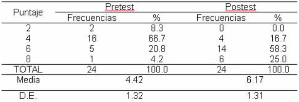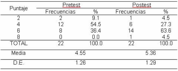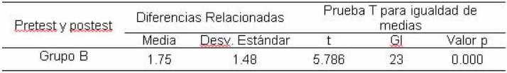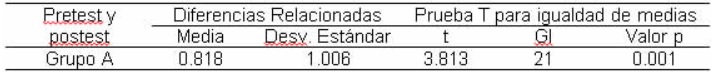 En el Grupo A, la diferencia de medias entre el pretest (M = 4.64) y el postest (M = 5,36), en la prueba T de Student para muestras relacionadas, arroja un valor de 0.818, p = 0.001; ello indica que se verifican diferencias estadísticamente significativas. Por ende, podemos concluir que ha habido cambios positivos en el Grupo A.
