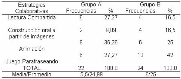 La relación entre la comprensión lectora de los estudiantes encuestados pertenecientes a los grupos A y B y la frecuencia de las estrategias colaborativas obtenida a partir de los datos se evaluó según la siguiente escala de puntuación: de 0 a 25, Deficiente; 25 a 50, Bajo; 50 a 75, Regular; y, finalmente, de 75 a 100, Alto. En relación con los puntajes obtenidos luego de la aplicación de las estrategias colaborativas, el Grupo A mostró que Animación obtuvo un porcentaje del 36,36 %, mientras que la Lectura Compartida y el Juego “Parafraseando” obtuvieron un porcentaje de 27,27 %. En cambio, en Construcción oral a partir de imágenes, el desempeño es bajo. Tres de las cuatro estrategias colaborativas permitieron mejorar el nivel de comprensión lectora en el Grupo A. El Grupo B reflejó un 25 % en Animación mientras que, en el Juego “Parafraseando”, mostró un 42 %. Las restantes estrategias alcanzan porcentajes más bajos. No obstante, los resultados del Grupo B también muestran que las estrategias colaborativas facilitan y estimulan no solo la lectura, sino que también mejoran la comprensión lectora del nivel literal.