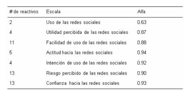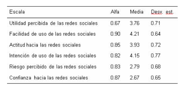 Como puede notarse, la escala con el alfa menor fue Utilidad percibida, con 0.67, siendo considerada aún como un índice de confiabilidad suficiente para ser tomada en cuenta, mientras que el resto de las escalas tuvieron índices por encima del 0.80, por lo que se consideran fiables. Con respecto a las medias por escalas, fueron las escalas de Confianza M=2.67 y Riesgo percibido M=2.79 aquellas que presentaron medias bajas en una escala Likert de 1 a 5. En tanto que las escalas con las medias más altas fueron Facilidad de uso M=4.21 e Intención de uso con M=4.15.