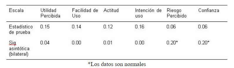 Según las pruebas de normalidad, cuando los niveles de significancia son p<0.05, se puede decir que existen datos normales, sin embargo, únicamente las escalas Riesgo percibido y Confianza cumplieron con este requisito, por lo que, al encontrar que la muestra no presentó datos normales en la mayoría de las escalas del instrumento, se tomó la decisión de continuar empleando estadística no paramétrica.