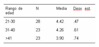 Como puede notarse, conforme aumenta la edad, disminuyó la percepción sobre la Facilidad de uso, siendo las personas con más de 41 años las que presentaron medias menores M=3.90, mientras que las personas entre 21 y 30 años presentaron una media de M=4.42, existiendo una diferencia significativa a p<0.05.
