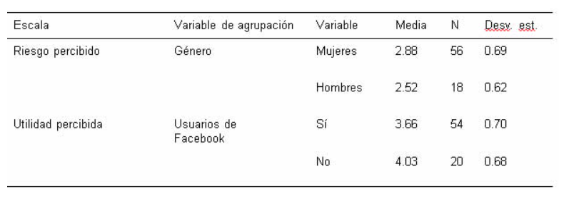 Como puede observarse, tomando como variable el género, se tuvo que las mujeres tienen una percepción de Riesgo percibido mayor (M=2.88) que los hombres (M=2.52), mientras que, al agrupar la muestra en usuarios (M=3.66) y no usuarios de Facebook (M=4.03), también se tuvieron diferencias de medias estadísticamente significativas en la escala de Utilidad percibida, ambos resultados significativos a p<0.05. No se encontraron diferencias estadísticamente significativas tomando en cuenta el tipo de dispositivo empleado para acceder a las redes sociales.