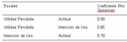 Como puede notarse, las correlaciones estadísticamente significativas se obtuvieron en las escalas de Utilidad Percibida, Actitud e Intención de uso, todas con un coeficiente mayor a 0.05, significativo a p=0.00. El resto de las escalas no presentaron correlaciones consideradas moderadas o fuertes.