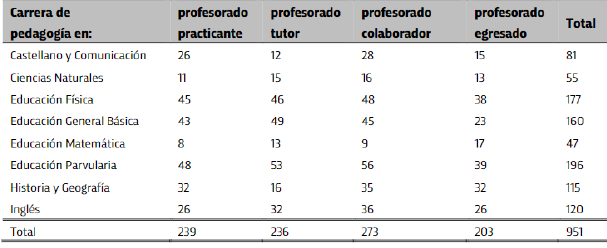 Durante la práctica profesional, la universidad contrata al profesorado encargado de acompañar, visitar, retroalimentar y evaluar al estudiantado en su respectivo centro de práctica. Este proceso es identificado como “sistema de tutoría” y es el vínculo existente entre la carrera y el centro educacional. Es el profesorado tutor quien presenta al estudiantado en los establecimientos y quien debe velar por su adecuada inserción en ellos, así como quien se relaciona con el profesorado colaborador que guiará y supervisará al estudiante en práctica debido a su relación contractual con el establecimiento.