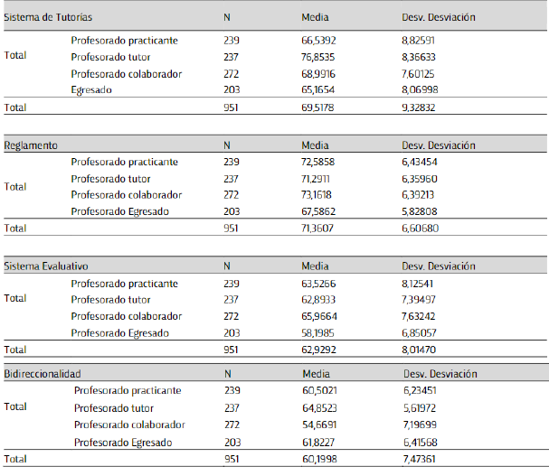 En la siguiente tabla, se pueden apreciar los puntajes de aceptación alcanzados por los distintos tipos de informantes respecto de las cuatro variables presentes en el instrumento. La media de aceptación más baja se encuentra en la variable “Bidireccionalidad”, mientras que la más alta se presenta en la variable “Reglamento”.