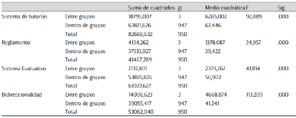 La prueba Anova demostró diferencias entre los distintos tipos de profesores y egresados respecto de las cuatro dimensiones presentes en el instrumento, cuando el valor: Sig <0,050.