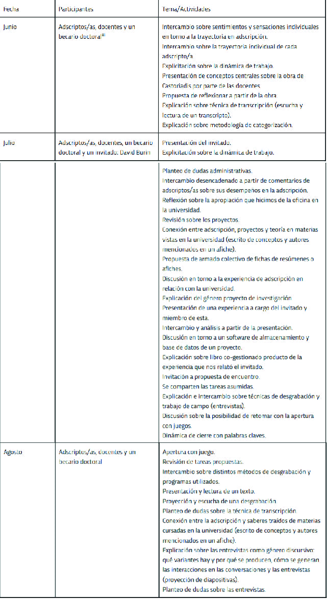 Los/as adscriptos/as y las docentes fuimos participando por igual en la documentación del proceso de nuestro aprendizaje grupal a través de diversos soportes: audiograbaciones de las reuniones, bitácoras, fotografías, crónicas y audios de actividades realizadas en el campo de trabajo, resúmenes y fichas de materiales leídos, afiches y PowerPoint preparados. Esta documentación tenía dos propósitos. Por un lado, tener múltiples medios de comunicación interna de lo que íbamos realizando y aprendiendo. Por otro lado, tener un acervo documental que podría convertirse en corpus de reflexión en momentos posteriores, para cualquiera de quienes estuvimos involucrados/as. A diferencia de otras situaciones, donde se supone que son las personas que coordinan las que usarán el material para luego reflexionar y escribir sobre la experiencia, aquí, se planteó que este archivo era de propiedad colectiva y se construía cooperativamente. Las bitácoras, por ejemplo, eran narraciones escritas que cada uno/a realizaba para documentar y reflexionar sobre la experiencia. Teníamos la posibilidad de compartirlas entre los y las integrantes del equipo ya que las profesoras coordinadoras nos consultaron si queríamos construir un espacio virtual en el grupo, visible a cada participante, y estuvimos de acuerdo. Asimismo, a partir de las audiograbaciones y fotografías, pudimos registrar las reuniones e interacciones que en ellas se daban. Este material nos permitió armar un cuadro descriptivo de algunas de las reuniones, que sirve para ejemplificarlas (ver Tabla 1).