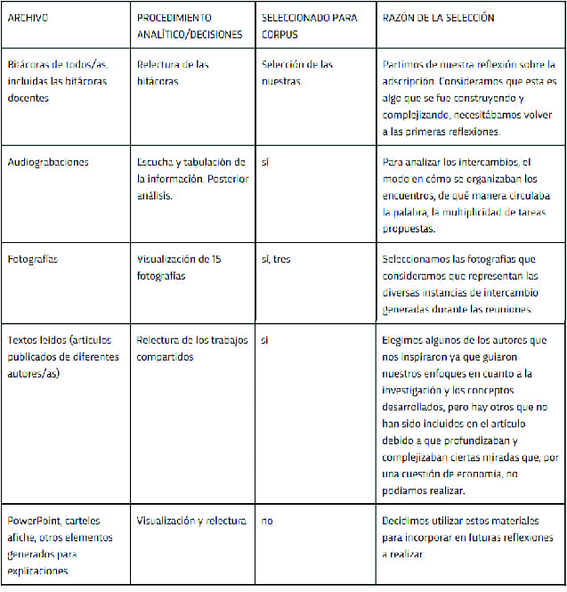 A los fines de este artículo, partimos de reunir y organizar el material que produjimos durante la adscripción, tal como se ve en la Tabla 2. Luego, a partir de nuestra interrogante, tomamos la decisión metodológica de utilizar únicamente nuestras bitácoras, las fotografías y las audiograbaciones de las reuniones. En función de este recorte, pudimos generar un corpus que nos ha permitido responder a nuestro interrogante sobre cuál fue la configuración didáctica que implementaron las docentes en el marco de la adscripción que posibilitaron un proceso de enseñanza-aprendizaje alternativo.
