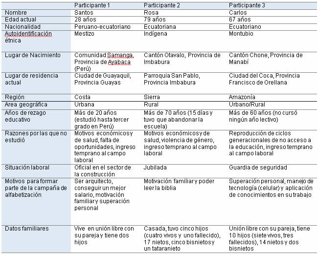 Justamente, en el encuentro de las trayectorias biográficas del estudiantado de alfabetización, se aprecia una riqueza de saberes y conocimientos ignorados que merecen ser analizados en aras de redescubrir el valor identitario que adquieren en la vida personal, comunitaria, cultural, pública, política y económica (Amaya y Fonseca, 2019). Para comprender la emergencia de estos nuevos saberes y aprendizajes, la presente investigación indaga los discursos que permean los procesos de alfabetización a través de la reconstrucción de tres historias de vida de estudiantes de la Campaña Todos ABC “Monseñor Leonidas Proaño”.