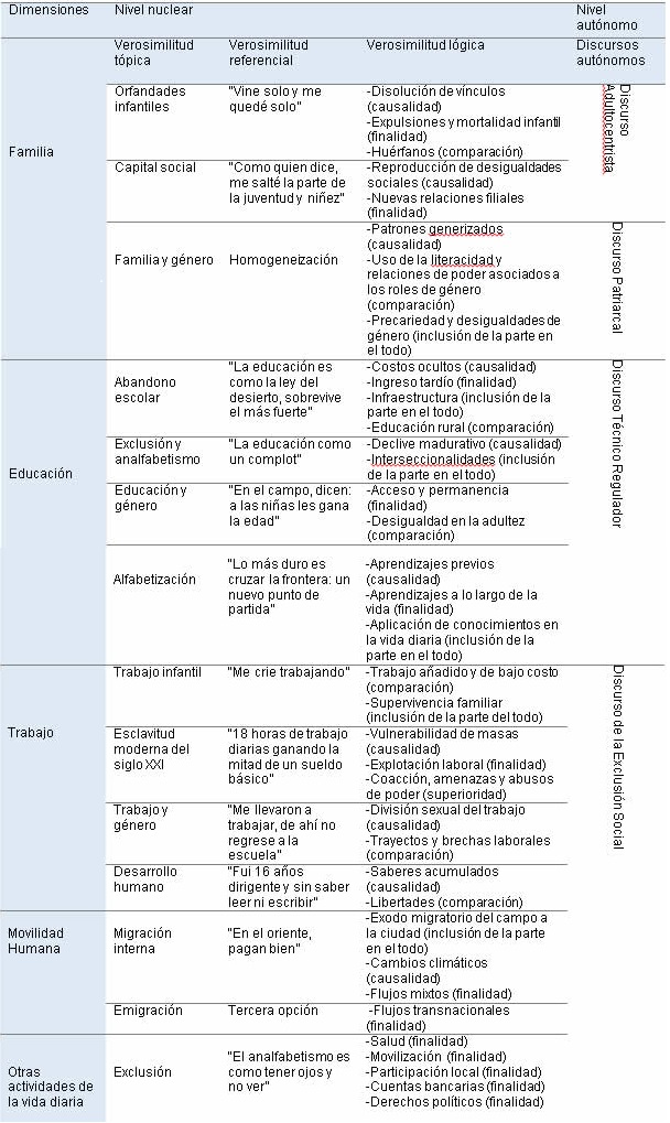 Existen dos vías para el análisis en este nivel, la primera consiste en agrupar discursos que tienen elementos parecidos de verosimilitud, lo que implica tipificarlos según los criterios internos del discurso (metáforas, posicionamientos binarios, argumentaciones o tópicos). La segunda vía consiste en agruparlos por criterios externos (clase social, género, o cualquier otro enunciado) para luego encajar las piezas discursivas con las verosimilitudes. Para efectos de este estudio, se optó por la segunda vía. A través de diversas dimensiones (familia, educación, trabajo, movilidad humana, género y otros ámbitos), se conectaron las verosimilitudes (nivel nuclear) y discursos autónomos (adultocentrista, patriarcal, exclusión social, técnico-regulador y de los otros saberes) de las y los participantes (ver Tabla 2).